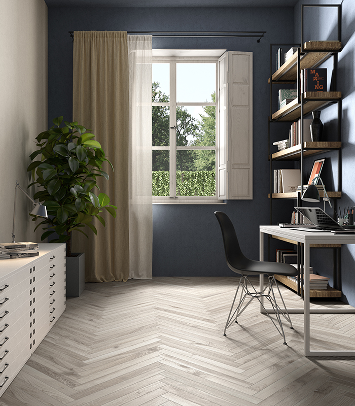 The strip in the Inari color, here elegantly laid in a herringbone pattern, perfectly embodies this technology. The result is a porcelain stoneware that not only faithfully reproduces the veins of precious wood, but offers a soft Natural surface, resistant to wear and absorption. Borealis thus extends the boundaries between interior design and the outdoor world, ensuring an aesthetic and functional foundation for the study or living environment, which today must be both a personal refuge and a professional context.